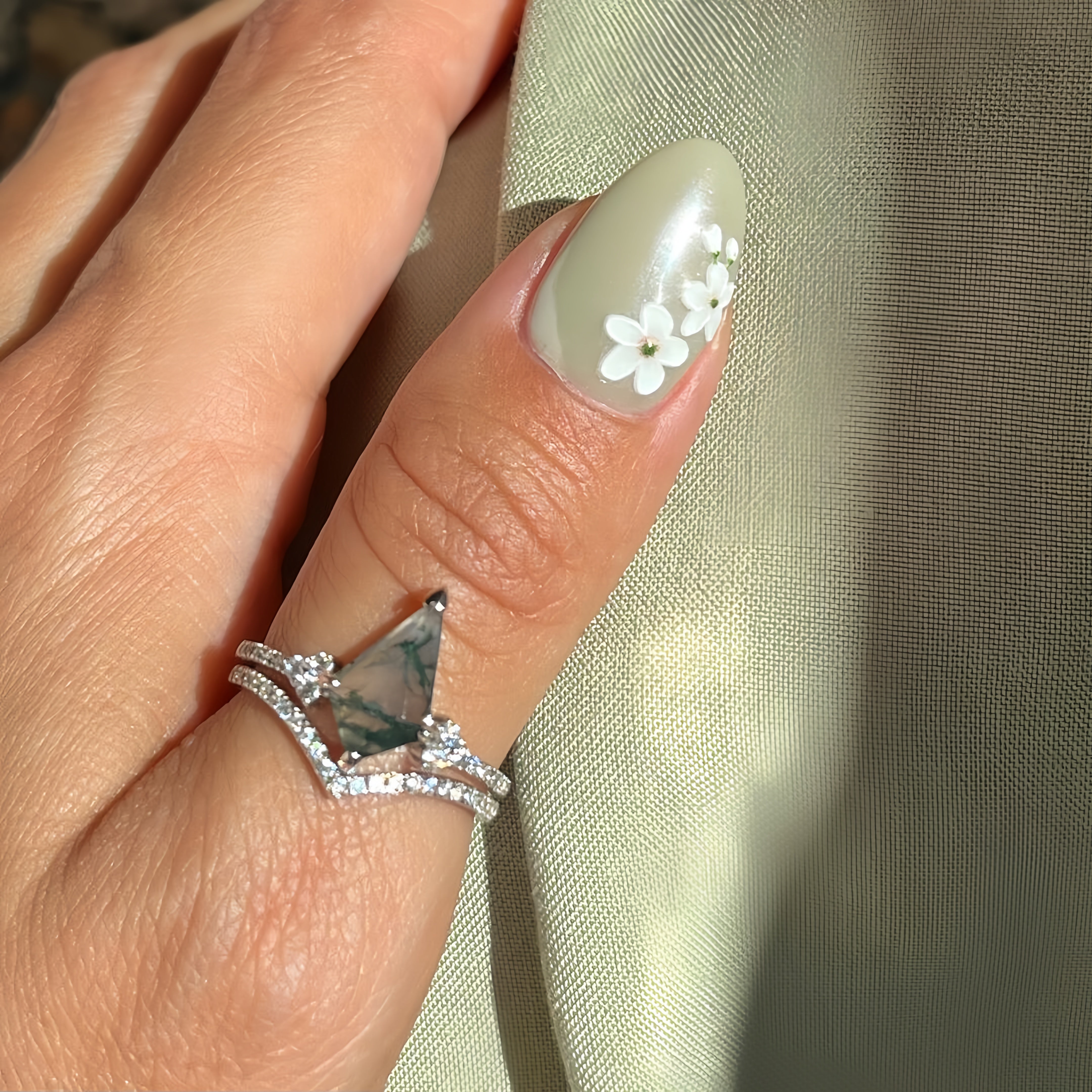 Rhombic Cubic Zirconia Moss Agate Engagement Layer Ring